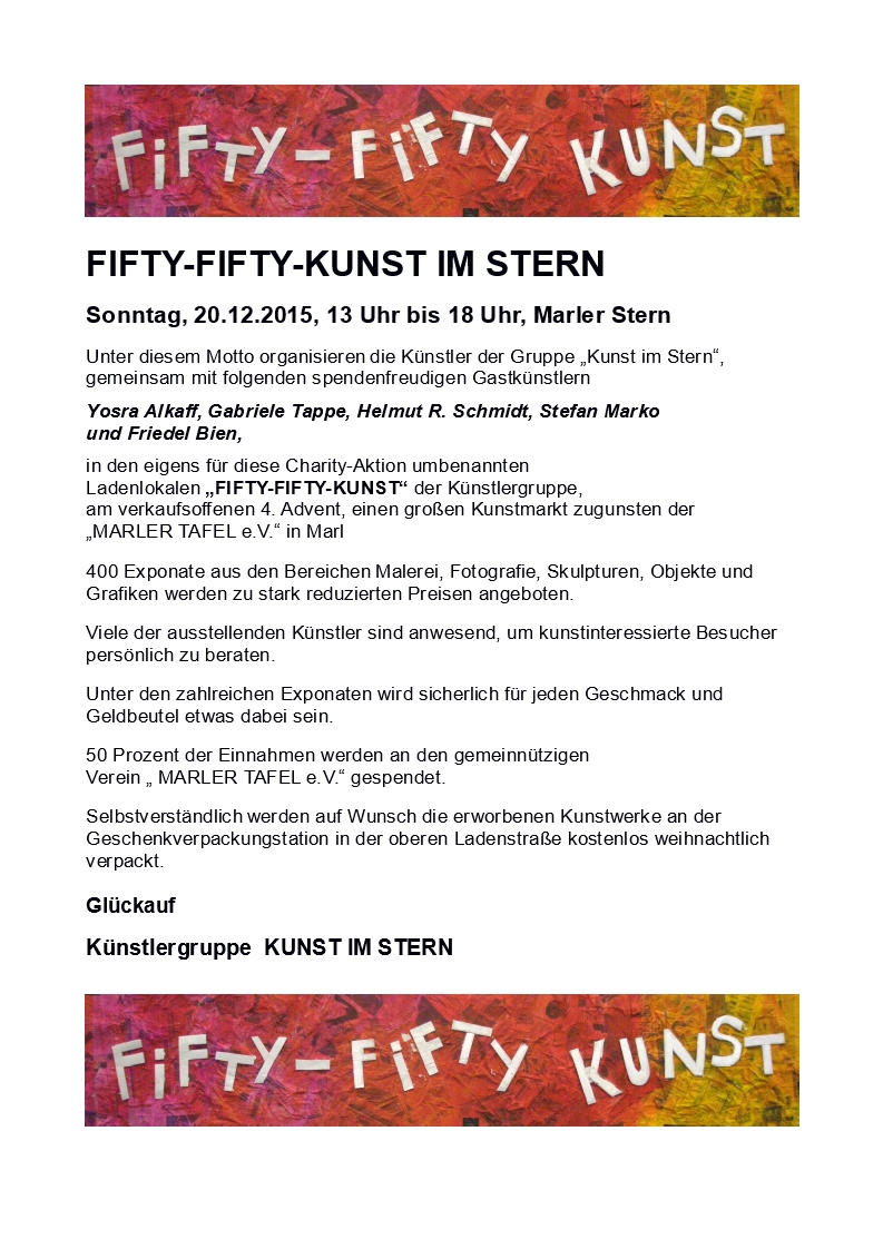 Dezember 2015: Teilnahme als Gastkünstler an der Charity-Aktion "Fifty-Fifty 2015" der Künstlergruppe "Kunst im Stern".
